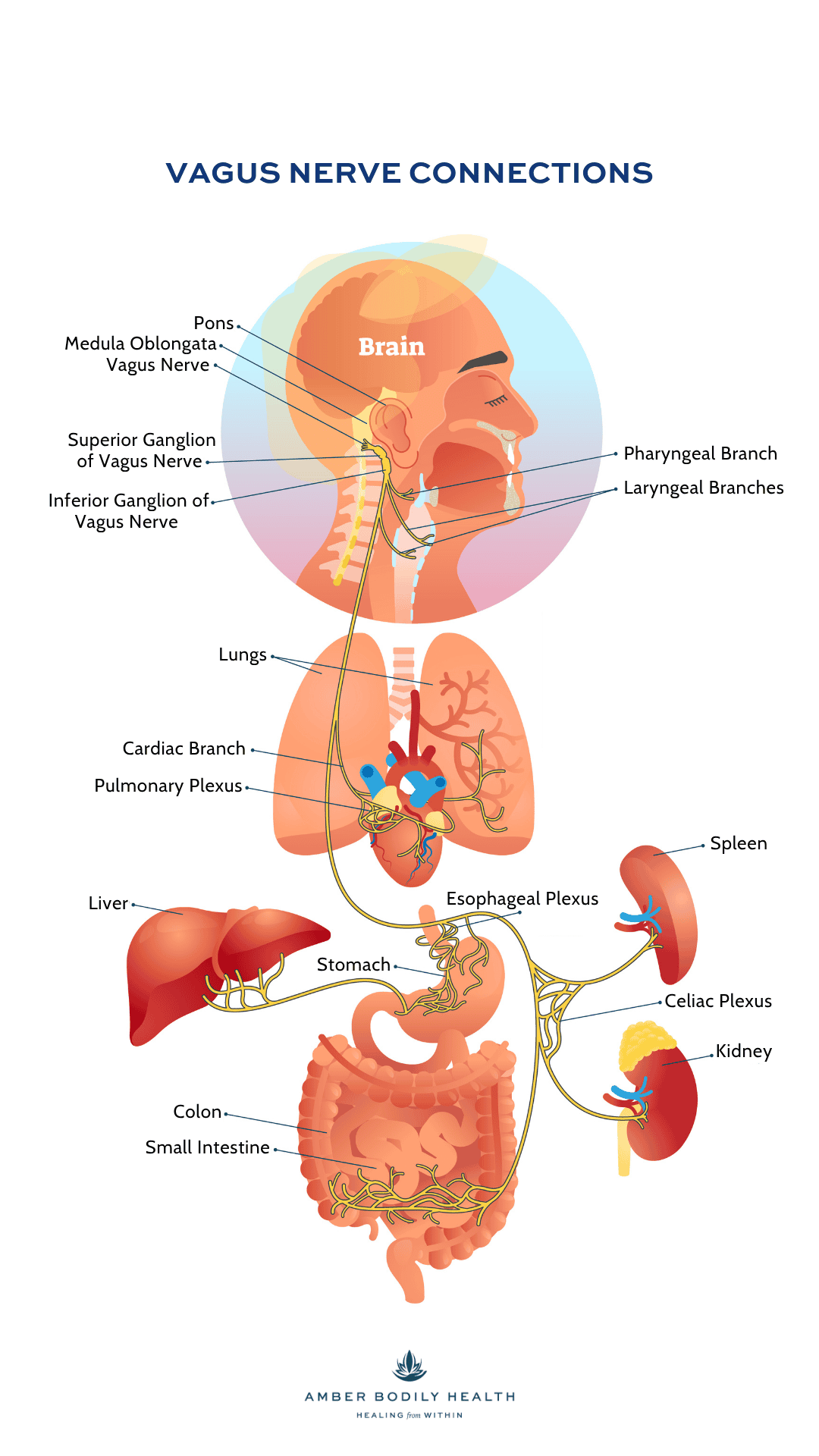 The vagus nerve is the longest cranial nerve in the body and a central player in this process. It originates in the brainstem and extends down through the neck, chest, and abdomen. Along the way, it innervates the heart, lungs, esophagus, stomach, intestines, liver, pancreas, kidneys, and spleen. As the main nerve of the parasympathetic nervous system, it plays a critical role in reducing inflammation, promoting digestion, and regulating immune function through the cholinergic anti-inflammatory pathway.